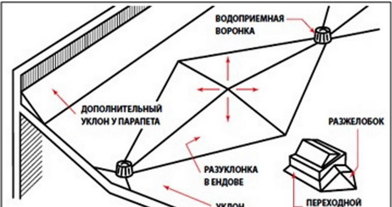 Если крыша строения является плоской, то в первую очередь нужно решить, каким способом будет выполняться на ней разуклонка. Так называют формирование одной или нескольких наклонных поверхностей (с уклоном в 1–5°), по которым вода будет стекать в водосточную систему. Можно поступить следующим образом: