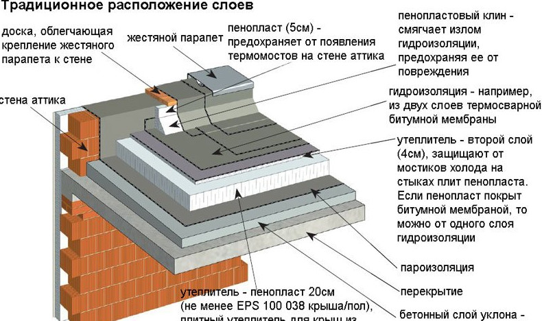 - Уложить с нужным уклоном утеплитель. Существуют специальные клиновидные плиты из экструдированного пенополистирола и минеральной ваты. Их укладывают вторым слоем поверх обычных плит. Керамзиту, шлаку и любому другому насыпному материалу уклон можно придать с помощью правила, предварительно установив маяки. Этот способ не слишком хорош, поскольку клиновидные плиты стоят дорого и не всегда имеются в наличии, а керамзит со временем продавливается, так что уклон может исчезнуть. Прибегают к нему тогда, когда плиты уже уложены и при этом рассчитаны только на снеговую нагрузку.