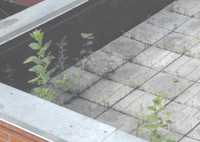 - Неправильное выполнение разуклонки. Серьёзный недочёт, в результате которого вода не будет полностью удаляться с покрытия. Там, где она останется, могут появляться гниль или растительность, со временем начнут появляться протечки, а с наступлением морозов кровельный пирог будет разрушаться льдом. Чтобы проверить правильность разуклонки, перед укладкой последнего слоя крышу нужно залить водой. Места, где остались лужи, обводят мелом, затем подсушивают и заклеивают фрагментом рулонного материала толщиной в 1 мм.