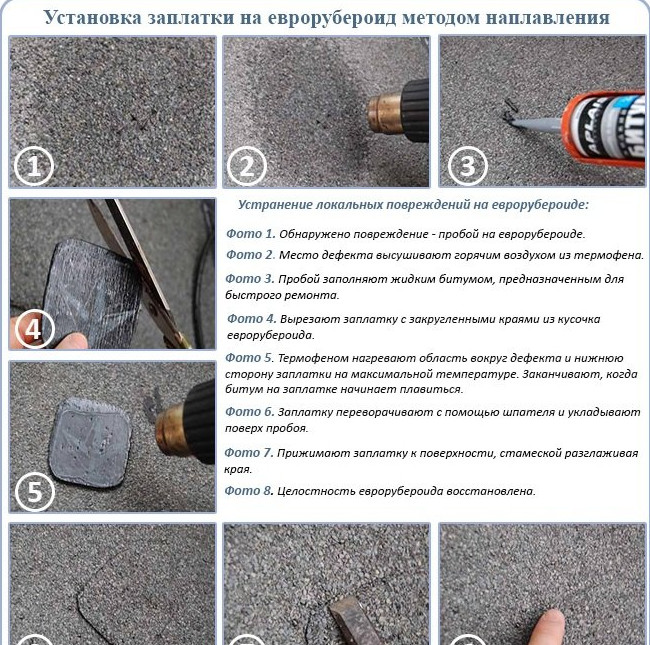 - При наличии отслоений: удаляют из полости грязь, затем подсушивают её строительным феном и тщательно приклеивают материал мастикой. Сверху отремонтированный участок также заливают слоем мастики.