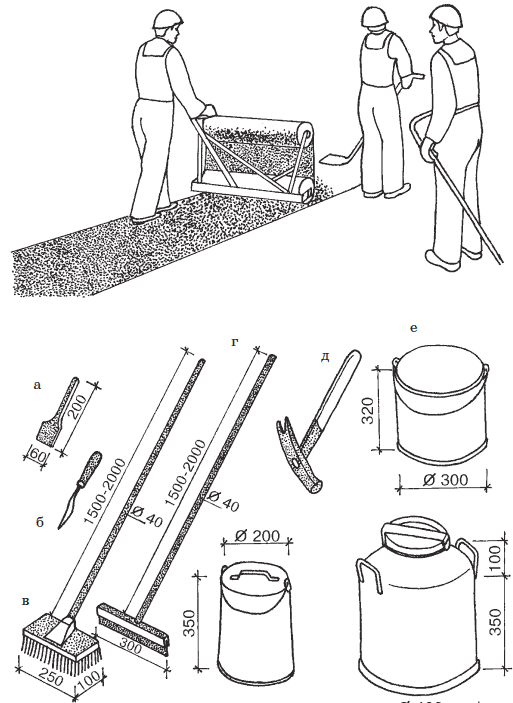 Ручной инструмент для кровельных и изоляционных работ: а — шпатель металлический; б — шило шорное; в — щетка для нанесения мастики; г — гребок с резиновой вставкой; д — молоток штукатурный; е — бачок для мастики ёмкостью 20 л; ж — ведро вместимостью 15 л; з — термос ёмкостью 25 л