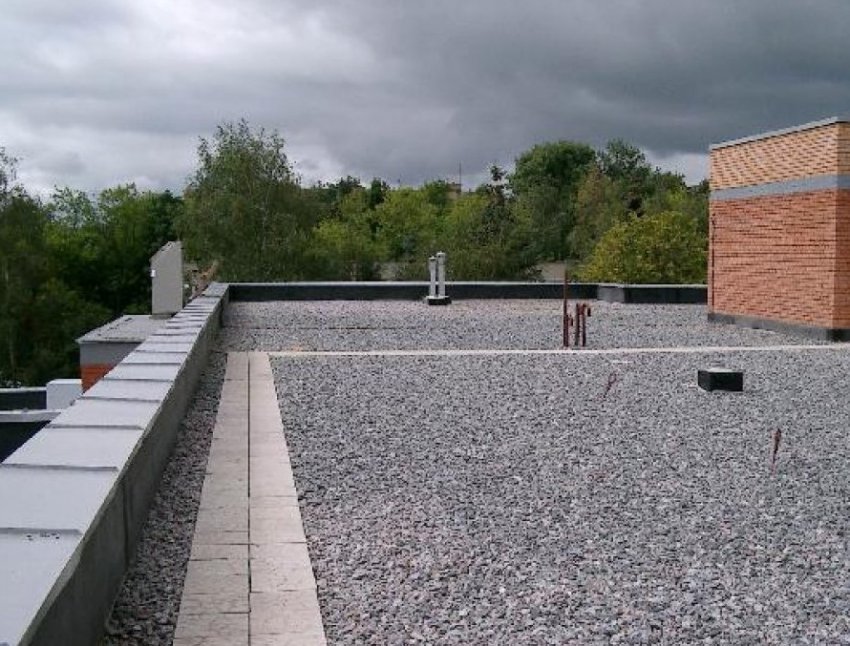 - Засыпка балласта. Для мембранной кровли идеально подойдёт гравийная смесь. Её нужно распределить равномерно по всей поверхности крыши.