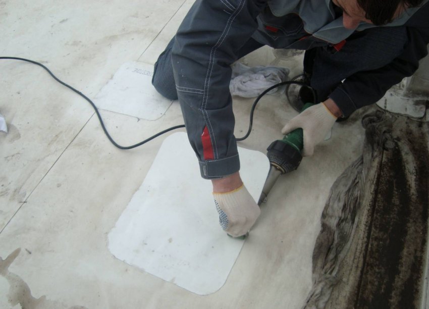 - Механические повреждения, в частности, разрыв гидроизоляции или прокол мембраны разными способами. Основной метод устранения повреждения — наложения заплатки. Для этого нужно тщательно очистить поверхность в области повреждения, удалив весь крупный мусор, обработать повреждённый участок специальным очистителем и припаять заплатку из аналогичного кровельного материала с помощью строительного фена.