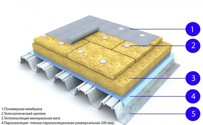 Мембранная кровля способна эффективно защищать здание от проникновения влаги внутрь, но при условии правильного её устройства. Типичный кровельный пирог под мембранным материалом состоит из следующих слоёв: