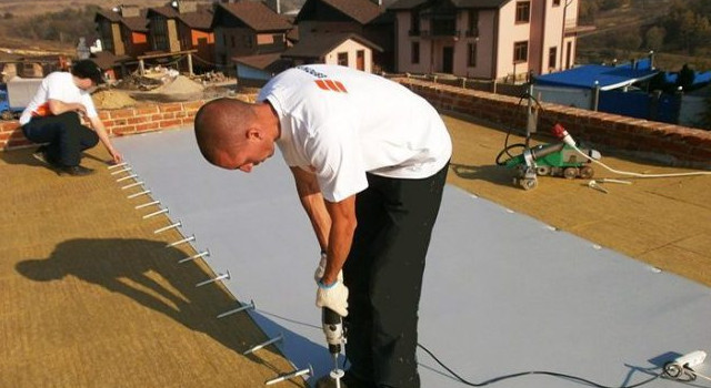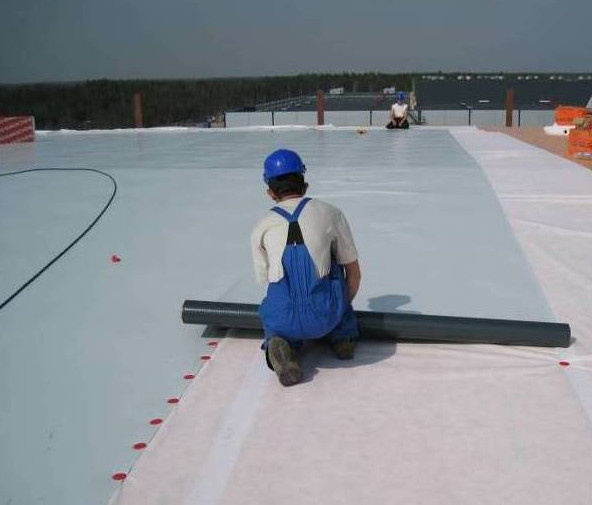 - Монтаж ПВХ-мембраны. Укладывать листы нужно с нахлёстом в 15 см. На деревянную обрешётку мембрана фиксируется телескопическим крепежом с саморезами, на бетонную поверхность — дюбель-гвоздями.