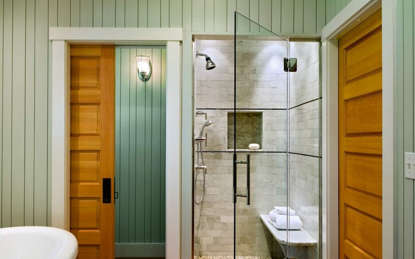 - Назначение конструкции, например, дверь в душевую зону или в основное помещение ванной комнаты.