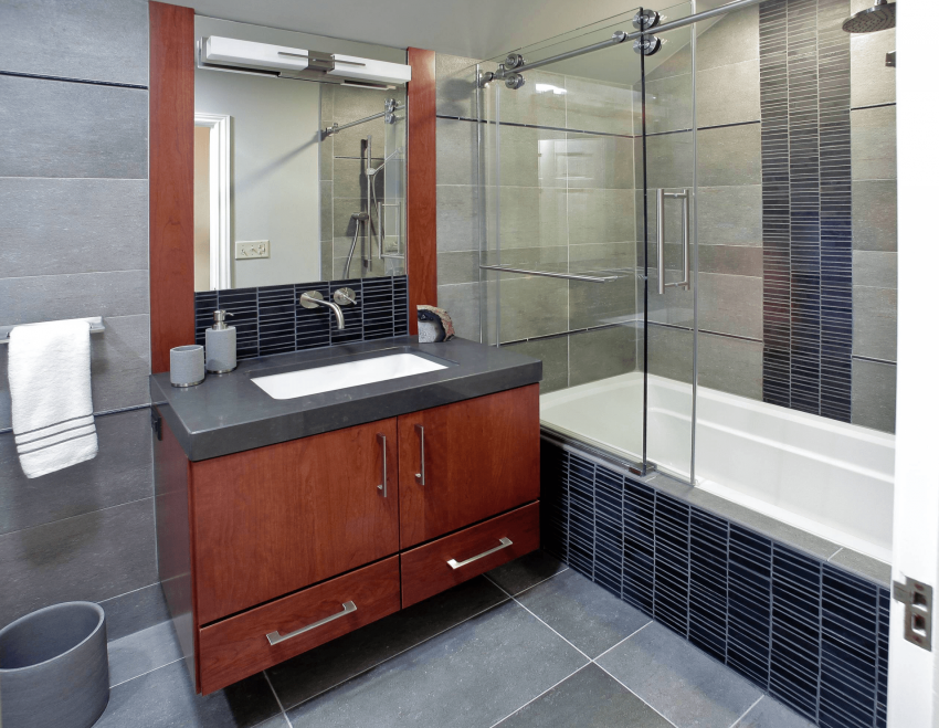 Раздвижные двери редко устанавливают в ванной, но они выглядят стильно