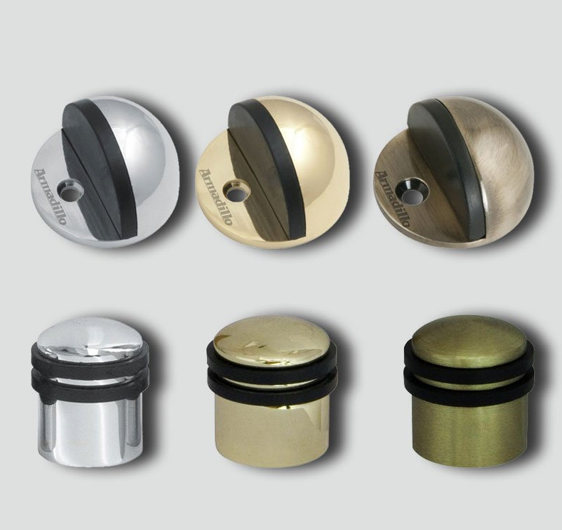 - Ограничители или упорные детали выполняются из металла, резины, пластика. Напольные варианты крепят саморезами на пол в том месте, дальше которого полотно не должно открываться. Уголковые ограничители могут монтироваться на стену, противоположную расположению петель. Фиксация проводится на водостойкий клей.
