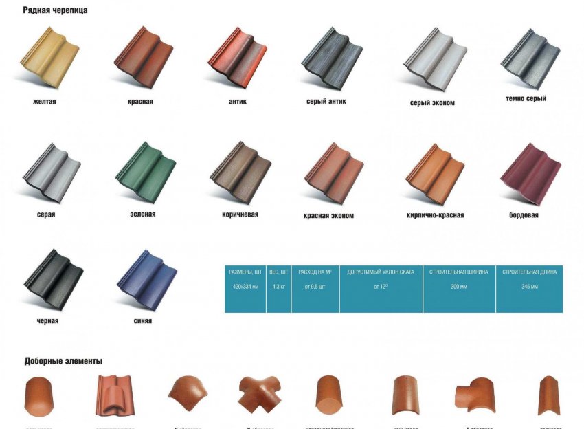 Существует и черепица с размерами 410х240 мм: её потребуется 15 штук на 1 м2. Но такими параметрами обладает рядная черепица, а соединительные доборные детали подбираются в зависимости от габаритов конструкции.