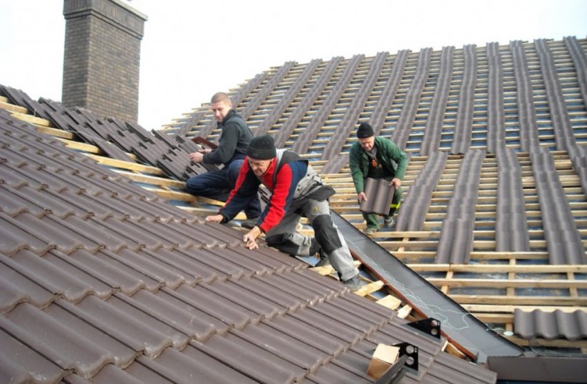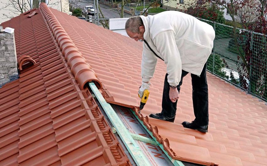 Перед началом строительства на все деревянные части крыши нужно из распылителя нанести антисептик, а на металлические — антикоррозийное средство. После набивки обрешётки герметизируется дымовая труба: на ней крепится лента с армирующей сеткой. Если в конструкции крыши предусмотрена ендова, то в эту область укладывается уплотнительная лента. Затем начинается процесс укладки черепицы: