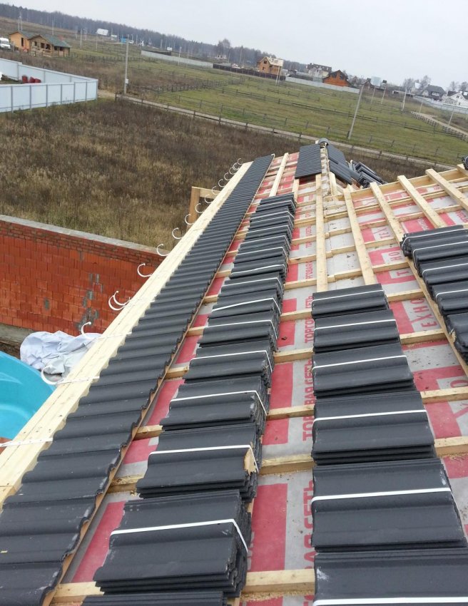 - обязательно стелится гидроизоляционная плёнка и крепится обрешётка с шагом 31–34,5 см;