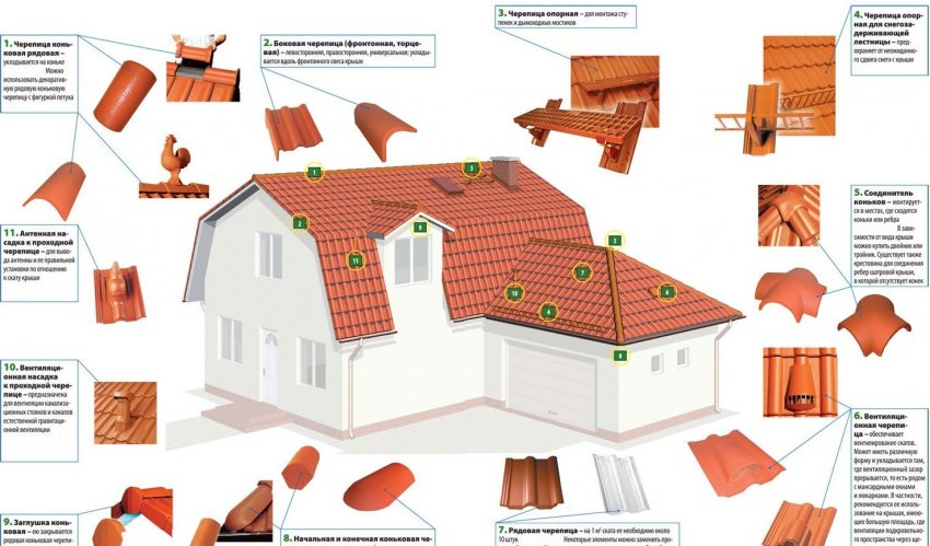 Черепица различается по форме: каждый вид предназначается для оформления разных мест крыши