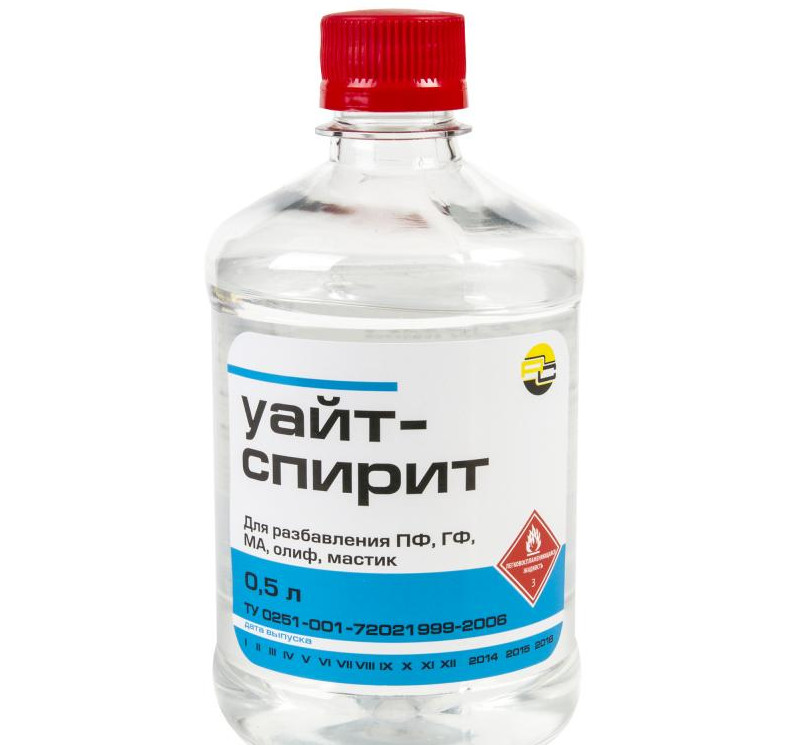 - Применение растворителя. Допускается применение слабого раствора, причём делать это нужно максимально осторожно. Лучше всего взять для этой цели «Уайт-Спирит». Средство надо налить на обрабатываемую область, немного подождать и удалить плёнку.