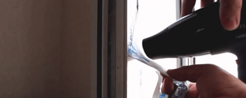 - Использование строительного фена. Для удаления плёнки струю воздуха нужно направлять на раму и следить, чтобы она не попала непосредственно на стеклопакет. В результате воздействия горячего воздуха плёнка растворяется и удаляется практически самостоятельно. Но обычный фен не поможет.