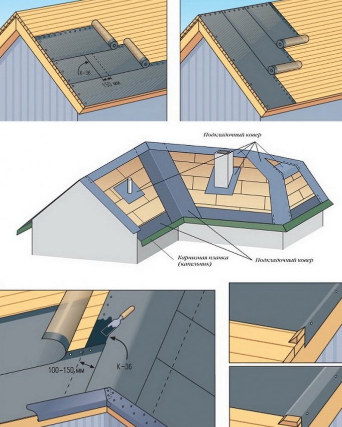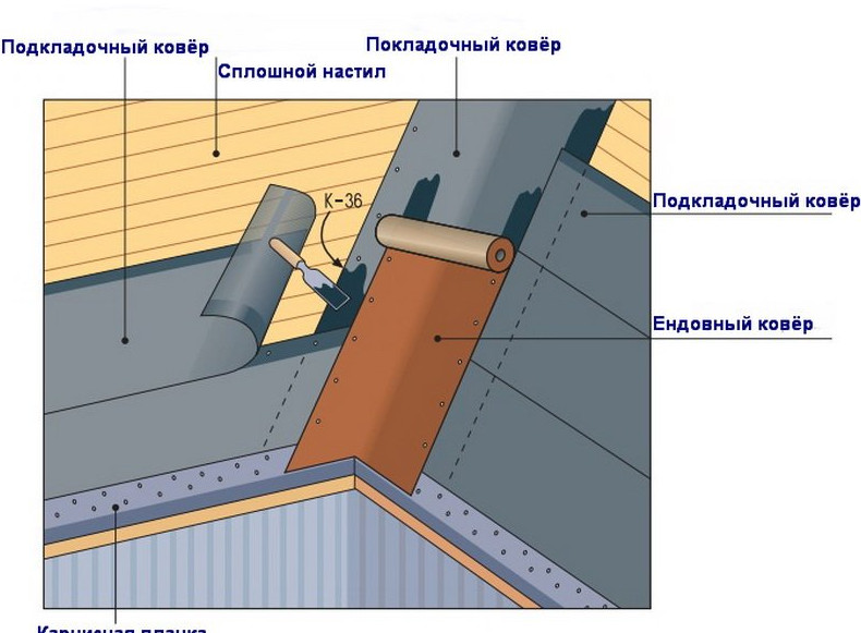 - потребность в мастичных составах: для приклеивания нахлестов подкладочного материала — 100 г/погонный метр, ендовного — 400 г/погонный метр;