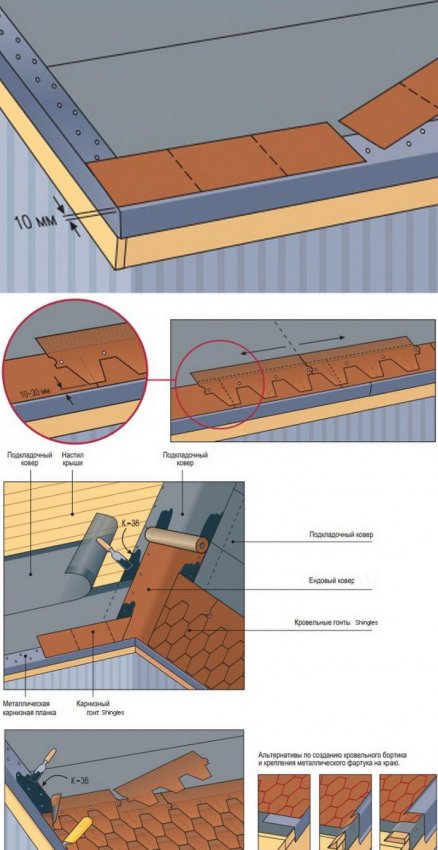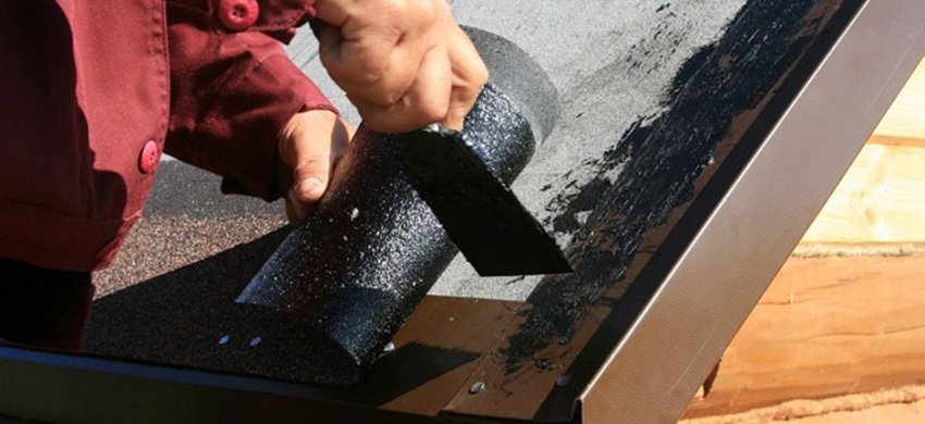 На краях скатов гонты обрезают и укладывают на слой битумной мастики шириной 10 см