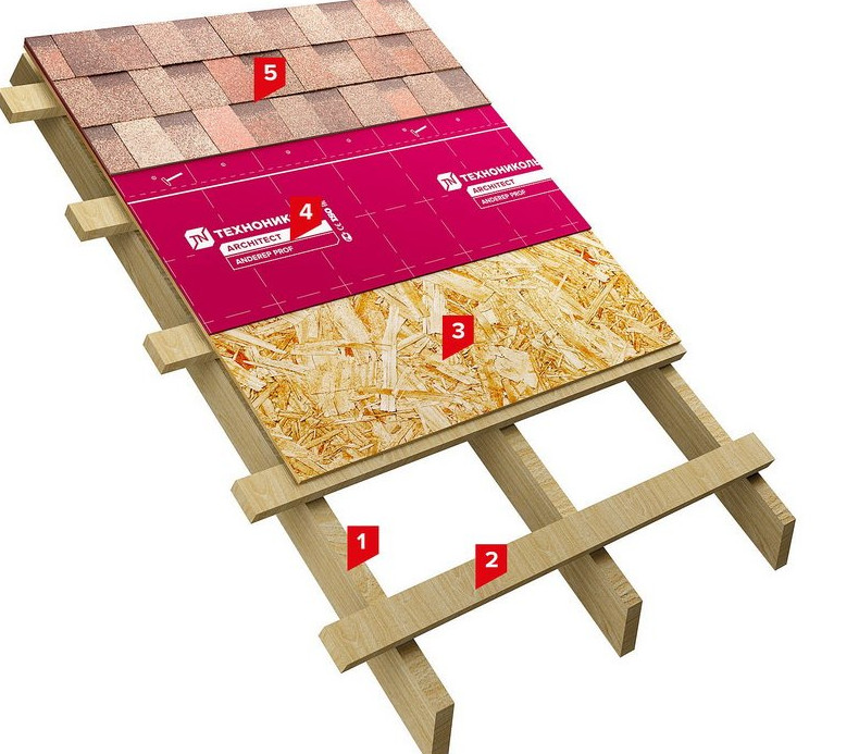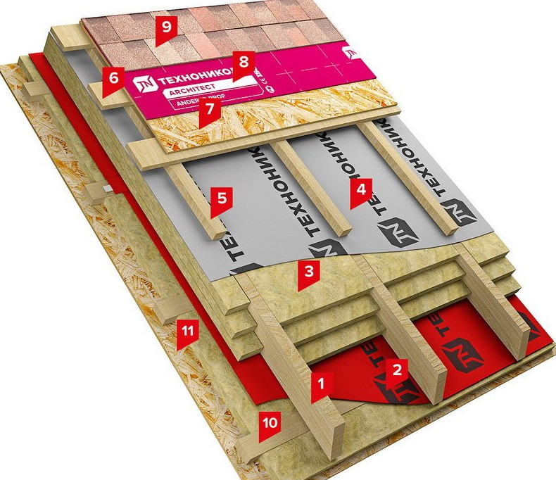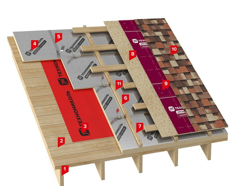 В составе стандартного кровельного пирога под мягкую черепицу «Шинглас» имеется три разных гидроизоляционных слоя, одним из которых является само кровельное покрытие