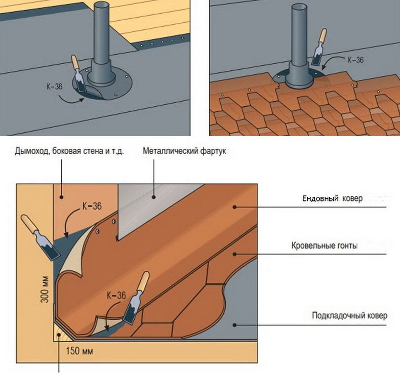 Места выхода небольших вентиляционных элементов герметизируются с использованием резиновых уплотнителей, а проход дымовых труб защищают теплоизолятором с прокладкой ендовного ковра