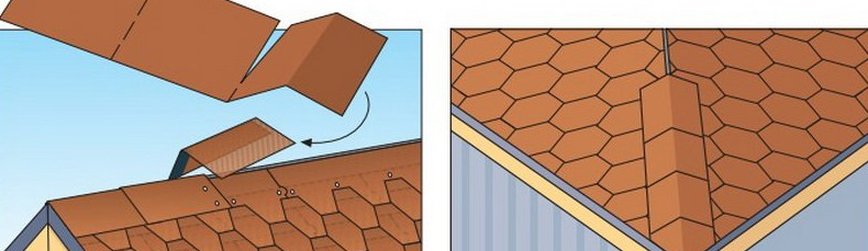 Рёбра скатов и коньковые узлы отделывают специальными полосами, состоящими из трёх гонтов