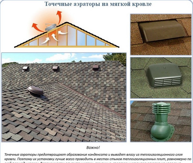 Точечные аэраторы для мягкой кровли, предотвращающие образование конденсата и намокание утеплителя, обычно располагают вблизи конька