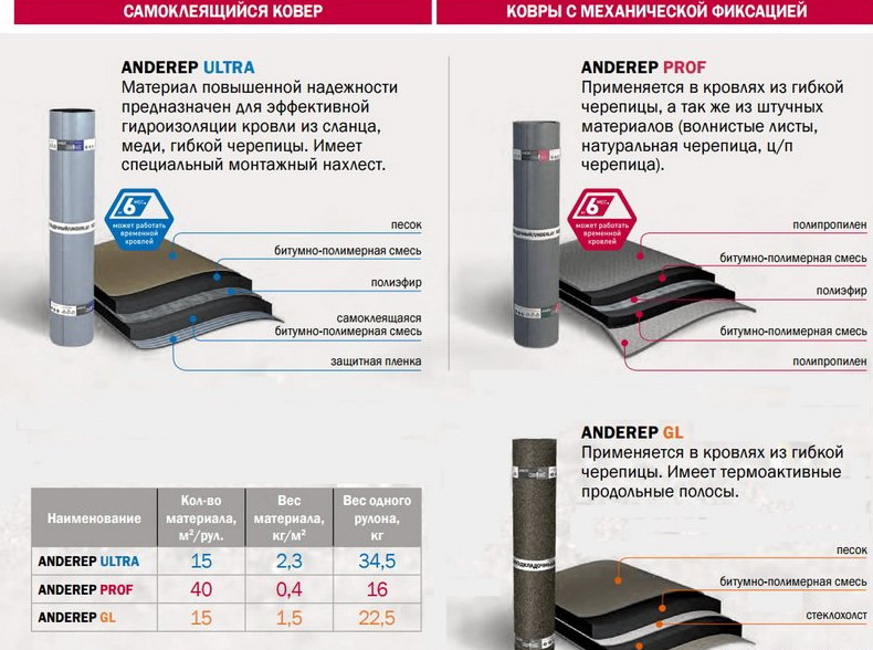 - Сверхлёгкий подкладочный ковёр Anderep PROF полиэфирной основой, выполняющий роль добавочной гидроизоляции.