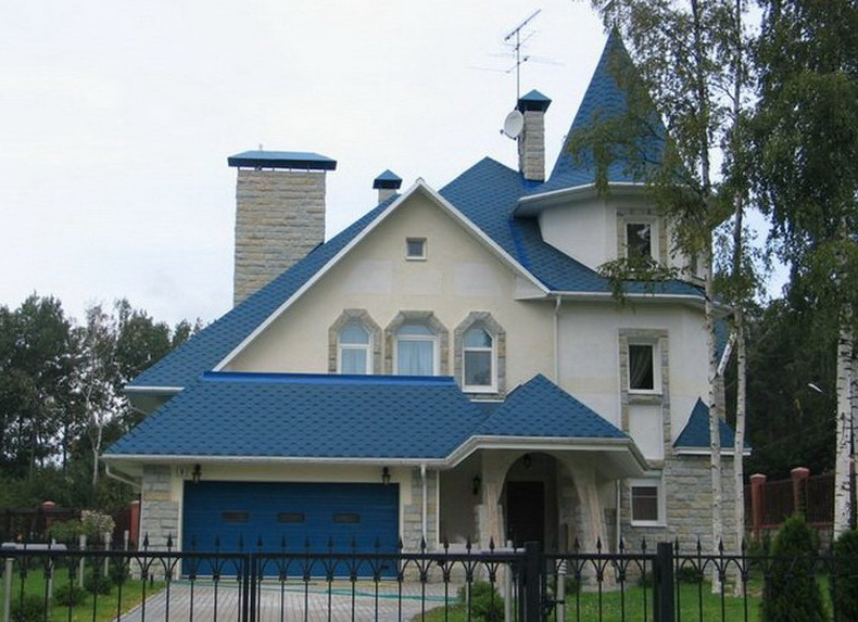Двухслойная черепица «Шинглас» серии «Ранчо» синего цвета органично дополняет зàмковый стиль дома, а фактурный рельеф придаёт кровле солидность и индивидуальность