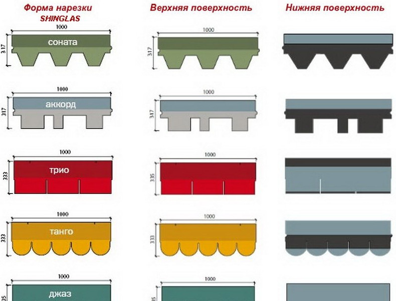 Черепица «Шинглас» нарезается в виде полос длиной 1 м, имеющих лепестки разнообразной формы