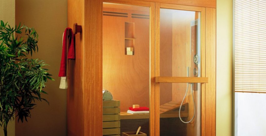 Плюсы распашных дверей из стекла для бани выражены в следующем: