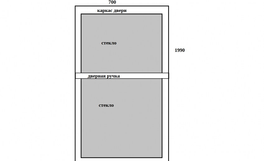 Конструкция двери включает в себя каркас и большое стекло,а также комплектующие элементы