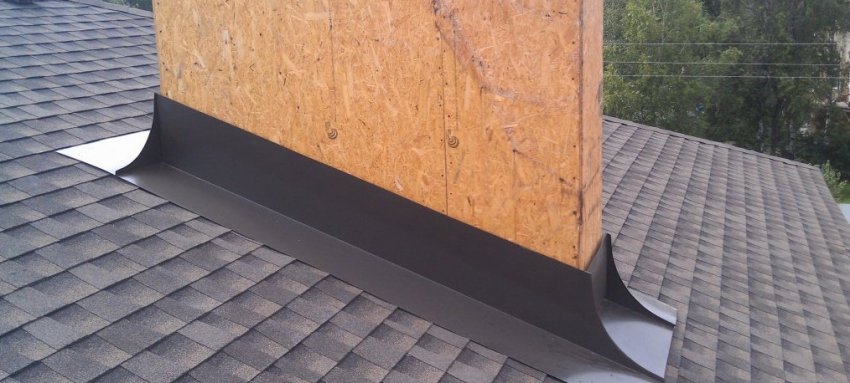 При наличии дымоходной трубы на скате крыши проводятся специальные подготовительные работы. Цель заключается в том, чтобы создать условия для надёжной герметизации места установки рядовой черепицы на поверхность трубы. Для этого используют фанеру или ОСП, из которых монтируют обсадной каркас. Его конфигурация копирует форму трубы, но отстоит от кирпичной кладки на 2–3 см. Фанера служит основанием для фиксации подкладочного слоя, поверх которого наклеивается черепица или надевается металлический кожух.