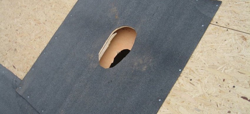 - В отведённом месте при помощи электрического лобзика, вырезается овальное отверстие по форме трубы аэратора. На обрешётке вокруг отверстия монтируется дополнительный слой гидрозащиты.