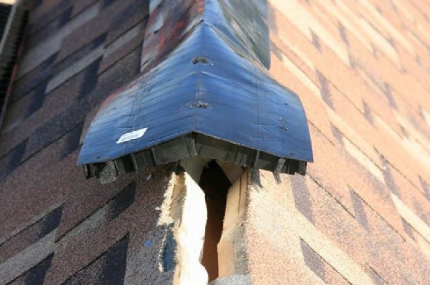- На 10–15 см в обе стороны от оси конька срезается поверхностный слой мягкой кровли и устраивается зазор сквозь весь кровельный пирог.