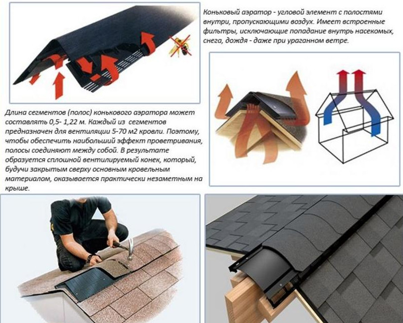 В верхней части устройства предусмотрены фильтры и бороздки, препятствующие проникновению извне насекомых, пыли и атмосферных осадков. Количество аэраторов на скате или коньке определяется по размерам пространства под кровлей и производительности используемых вентиляционных каналов. В зависимости от мощности один аэратор способен обеспечить циркуляцию воздуха на площади от 10 до 90 м2.
