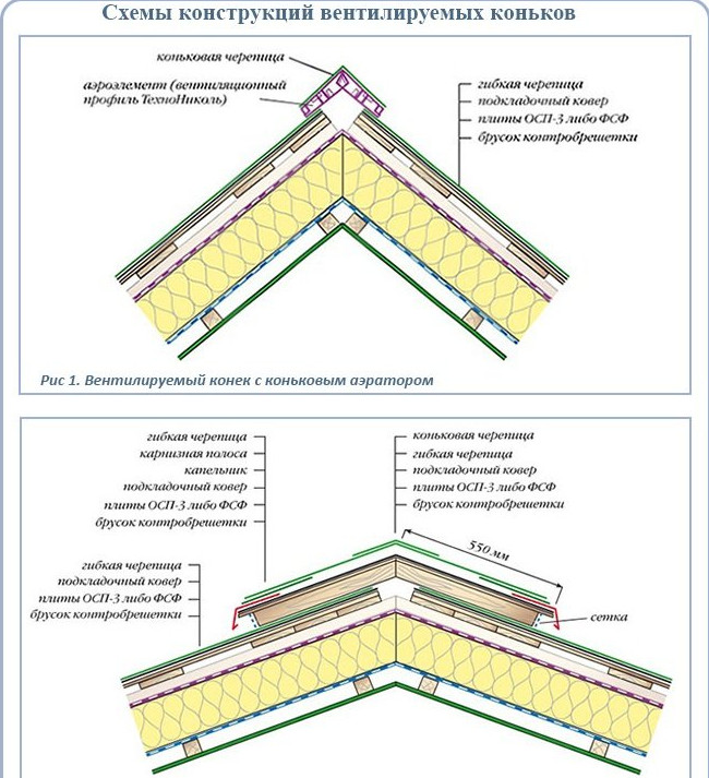 Проблема вентиляции подкровельного пространства решается двумя способами. Первый — это установка готовых аэраторов, а второй — самостоятельное изготовление вентилируемого конька для мягкой кровли.