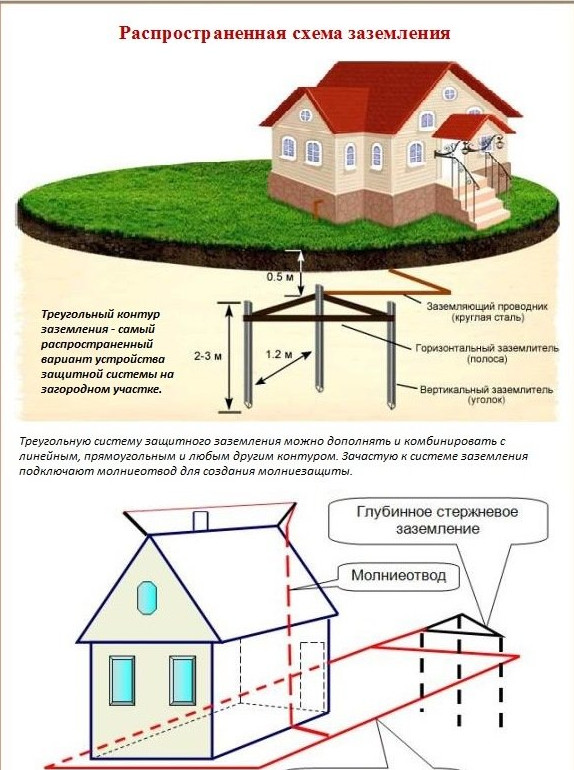 Контур заземления обычно представляет собой систему из трёх заглублённых металлических стержней, соединённых друг с другом металлическими уголками