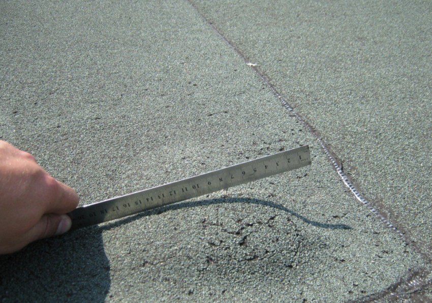 Но трещины появляются на любом материале из битума при нагреве поверхности в летний период, ведь температура на ней может превышать 100 градусов. Вторая причина растрескивания — образование луж на кровле с неправильным уклоном для водостока или при засорении сливной воронки.