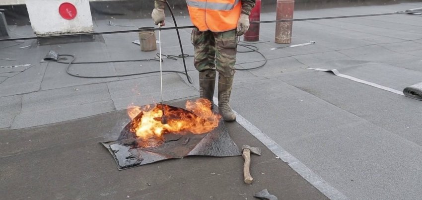 - Полотно укладывается на место, прогревается горелкой, прикатывается валиком.