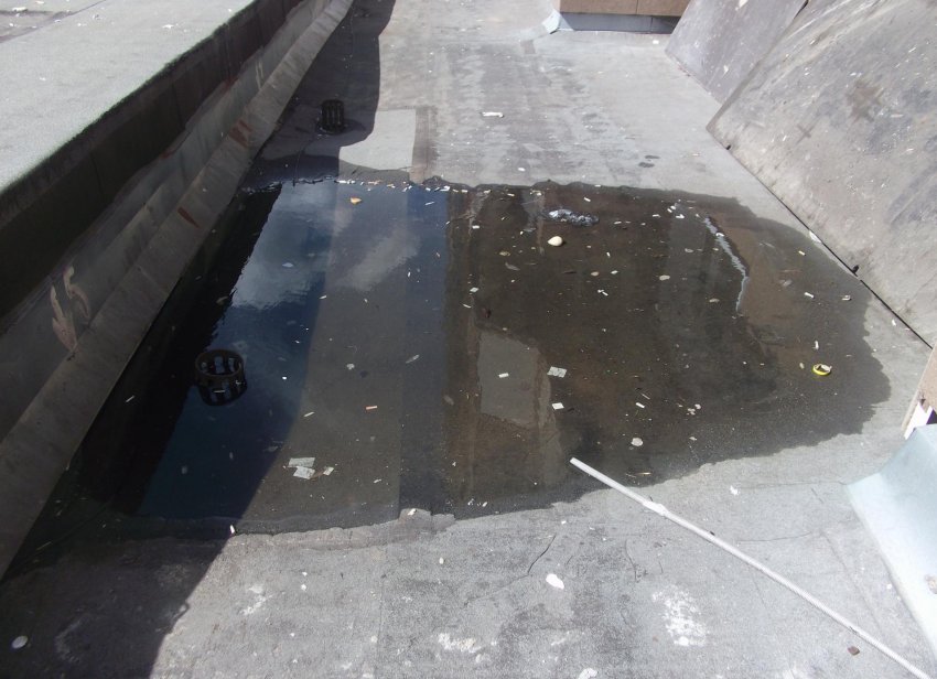 Засорение сливной воронки на крыше приводит к быстрому расслоению и разрушению кровельного покрытия