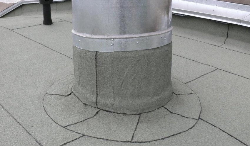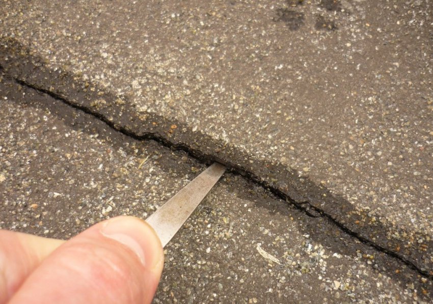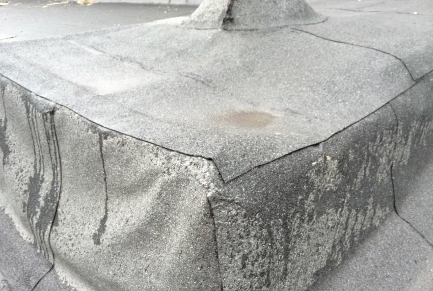 Небольшой участок кровельного покрытия с сетью трещин проще отремонтировать заливкой битумом в два слоя