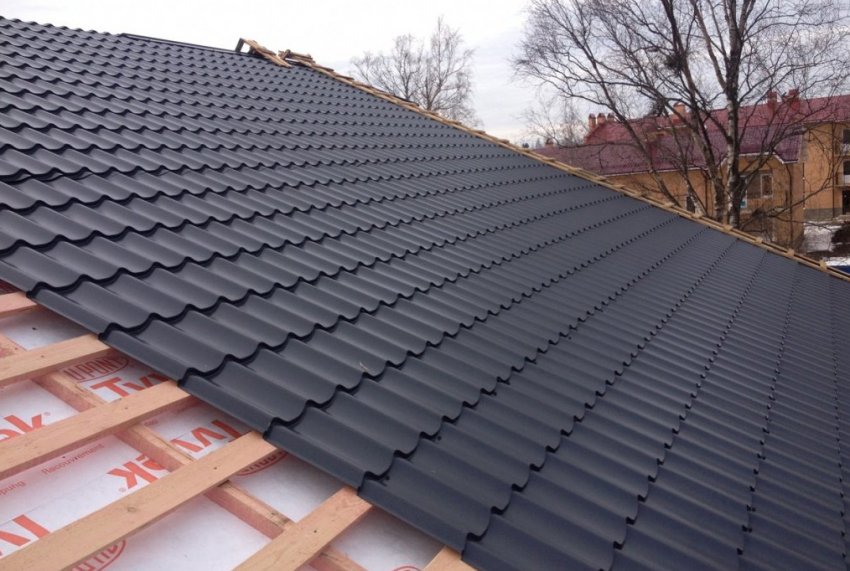 Длину листов металлочерепицы можно подбирать под размеры ската, поэтому даже большие кровли перекрываются ей довольно быстро