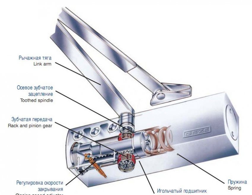- В конструкции имеется рычаг, в котором находится шестерёнка. Располагается она на оси. При открывании двери шестерёнка поворачивается и пружина сжимается.