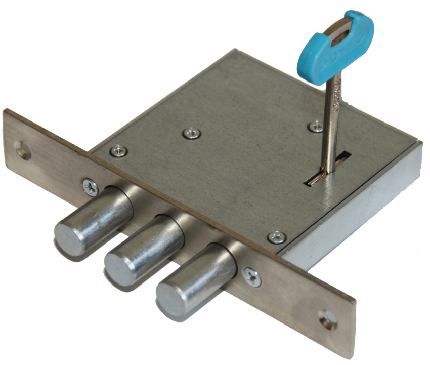 Работа первого варианта основана на следующем принципе: при повороте цапфы заходят в соответствующие отверстия и прижимаются к коробке. При движении ключа ригель выдвигается, замок запирается. Второй вариант замка подразумевает одновременный заход цапф в планки и движение ригеля.