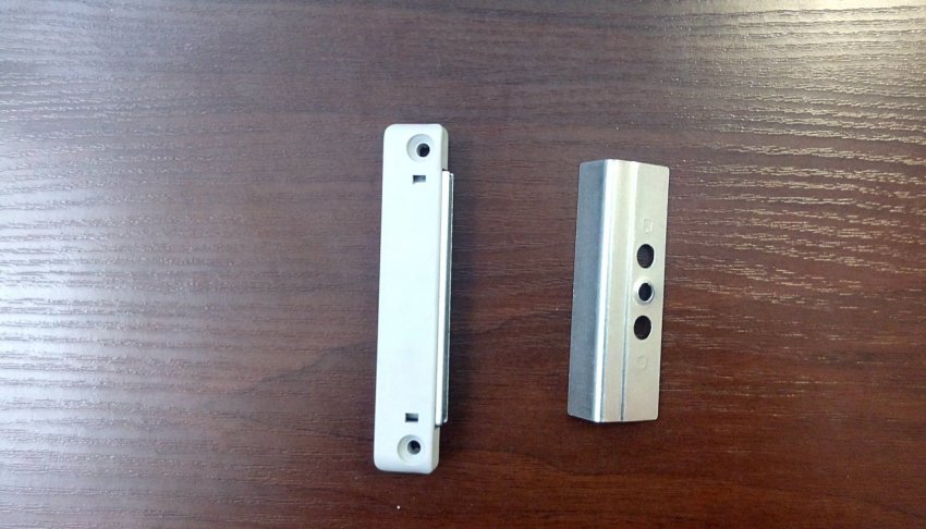 - Аналогичные действия сделать и на раме двери. Тут крепится металлический корпус, который также имеет внутри себя магнит. Устанавливать эти детали нужно на одном уровне.