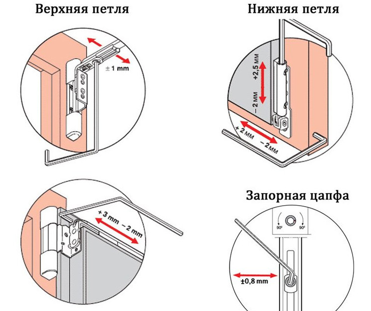 - После этого створку сместить в сторону, противоположную этому месту. Например, если створка задевает раму в нижнем правом углу, то створку нужно смещать вверх или в левую сторону.