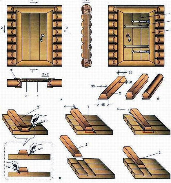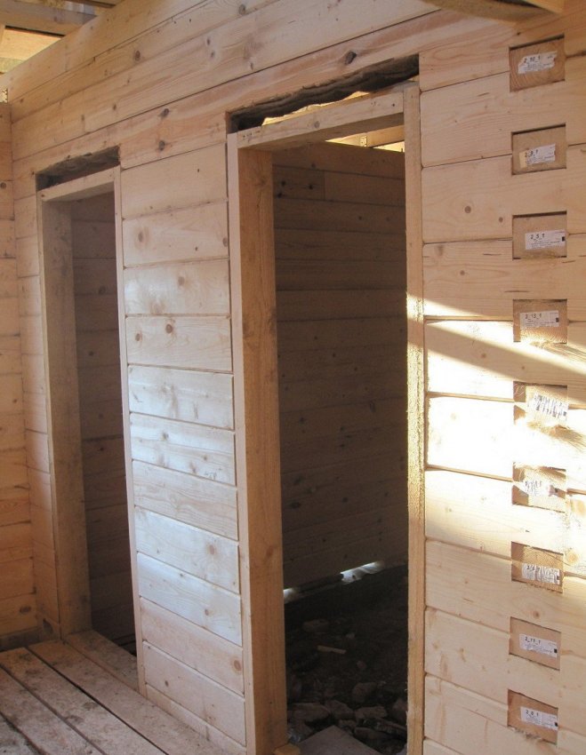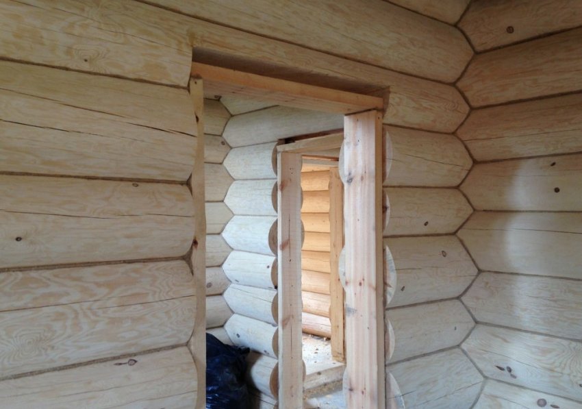 Монтировать дверную коробку в бревенчатую баню необходимо на дополнительный встроенный в проём брус