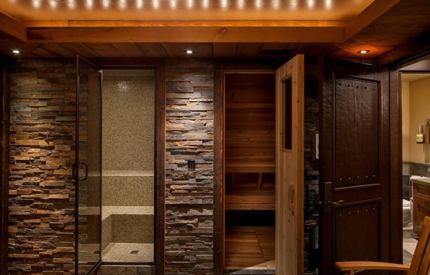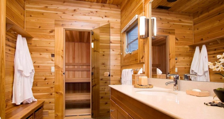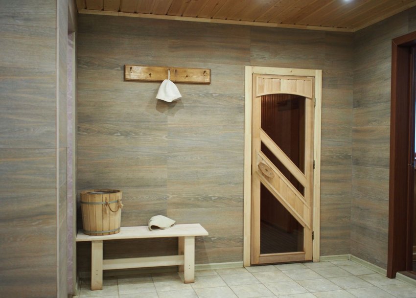 Внутри бани используются только деревянные и стеклянные двери, а для входа также применяются металлические и пластиковые.