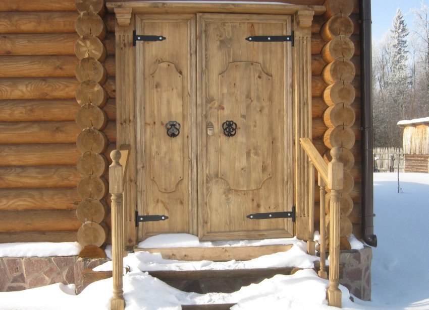 Входная уличная дверь в баню обычно утепляется, делается более массивной и украшается металлической фурнитурой