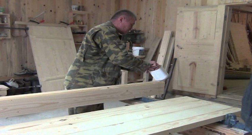Для склеивания щита из досок берётся только качественный мебельный клей, который не желтеет и не выделяет в воздух вредных химических испарений
