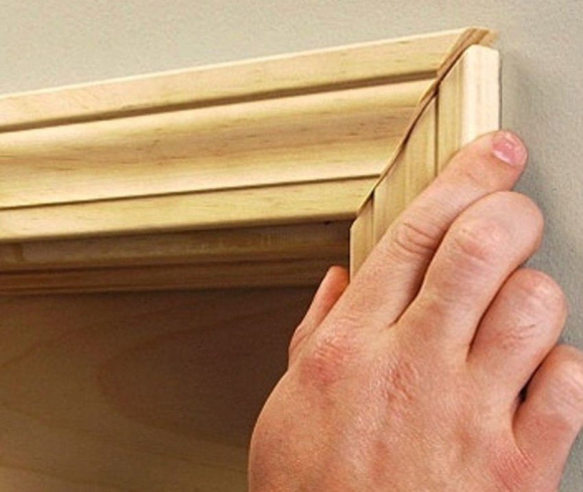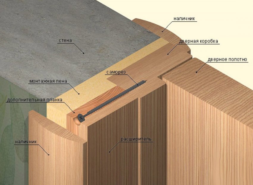 - Установить коробку в проём и оснастить притвором: либо выбрать фрезером паз по краю, либо прибить притворные планки (расширители). Поставить наличники.