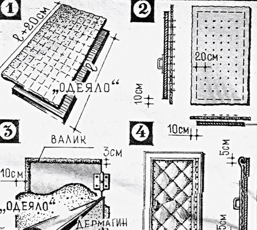 К дверному полотну дерматиновая обшивка прибивается гвоздиками с крупными шляпками. На лицевой стороне между ними натягивают проволоку или леску, что позволяет получить на поверхности объёмный ромбовидный рисунок.